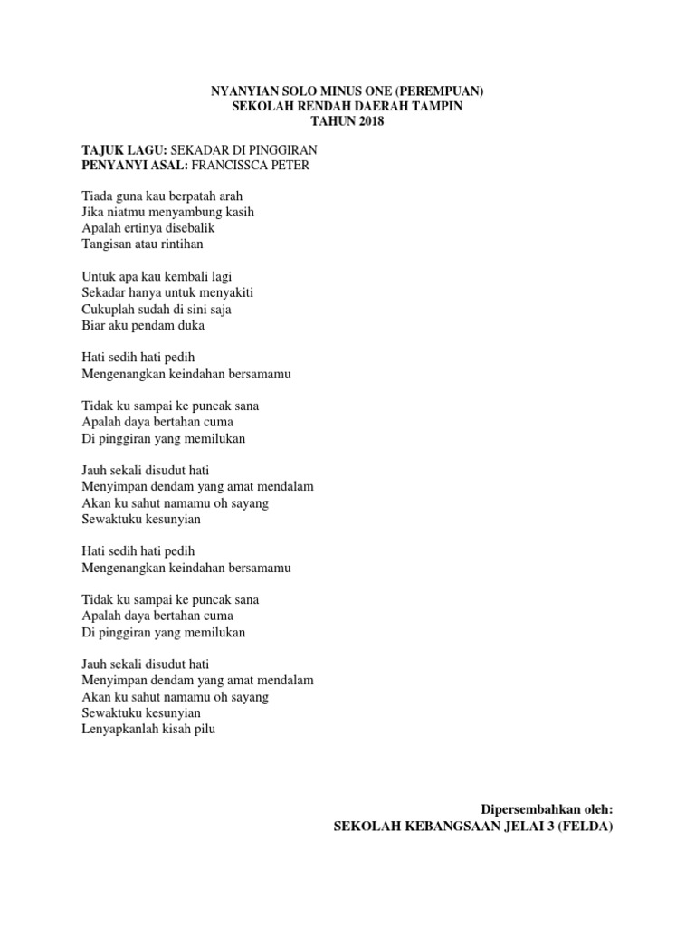 Saya teringat satu lagu dlm album sekadar di pinggiran ini berjudul pasti ciptaan manan ngah dan lukman s puas saya berkelana merata alam cyber mencari tak ditemukan jua. Em am em jauh sekali di sudut hati e menyimpan dendam am yang amat. Lirik lagu sekadar di pinggiran oleh francisca peter francisca peter sekadar dipinggiran tida guna kau berpatah arang jika niatmu menyambung kasih apalah ertinya disebalik tangisan atau rintihan untuk apa kau kembali lagi sekadar hanya untuk menyakiti cukuplah sudah disini saja biar aku pendam luka ulang hati sedih.