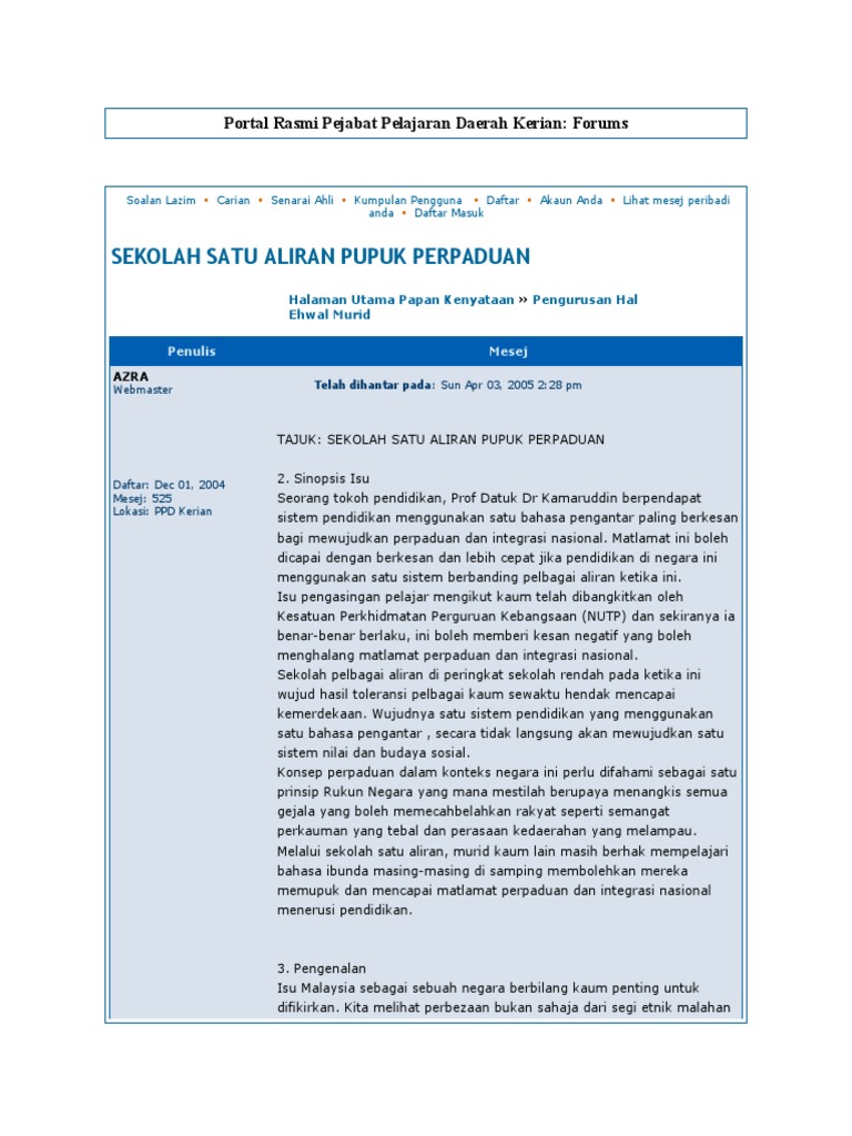 Utusan malaysia 16hb dis. Mufti perlis mohd asri zainul abidin mencadangkan supaya putrajaya mewujudkan sekolah satu aliran bagi menggantikan sistem persekolahan sedia ada di peringkat sekolah rendah. Sekolah satu aliran penggerak utama pupuk perpaduan wahid omar mahanum a aziz dan shahrizan salian kuala lumpur.