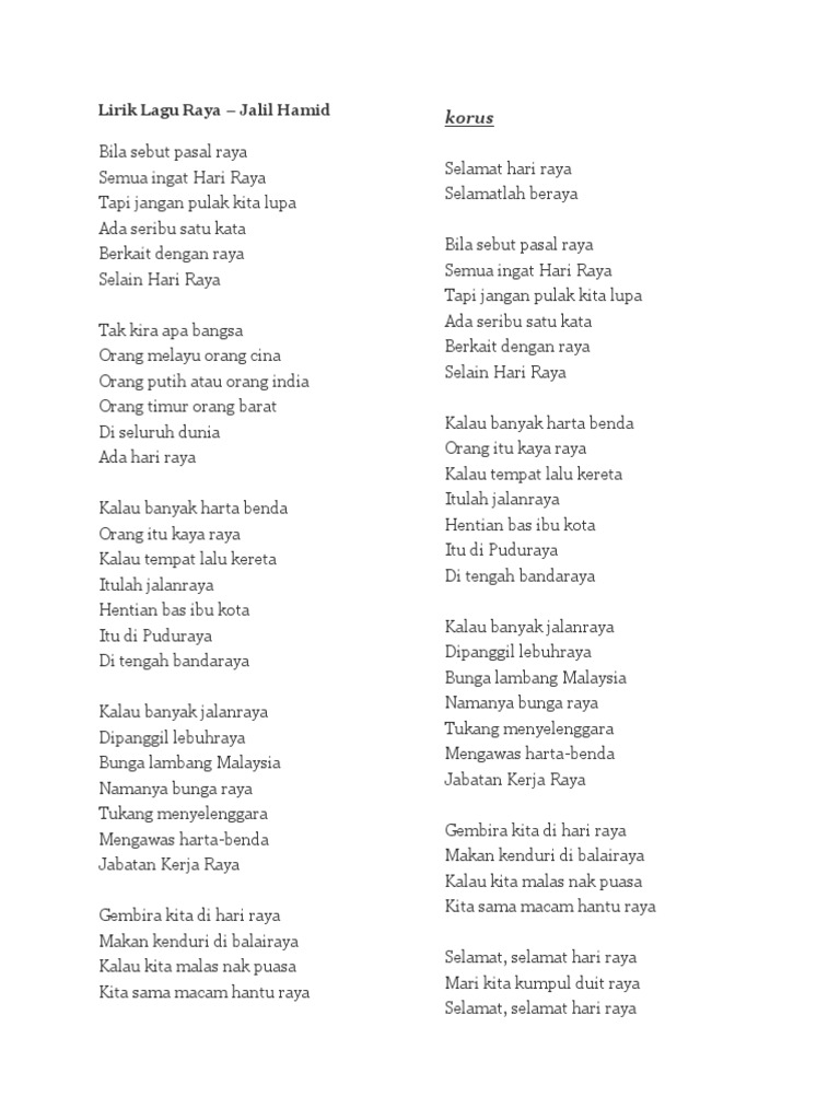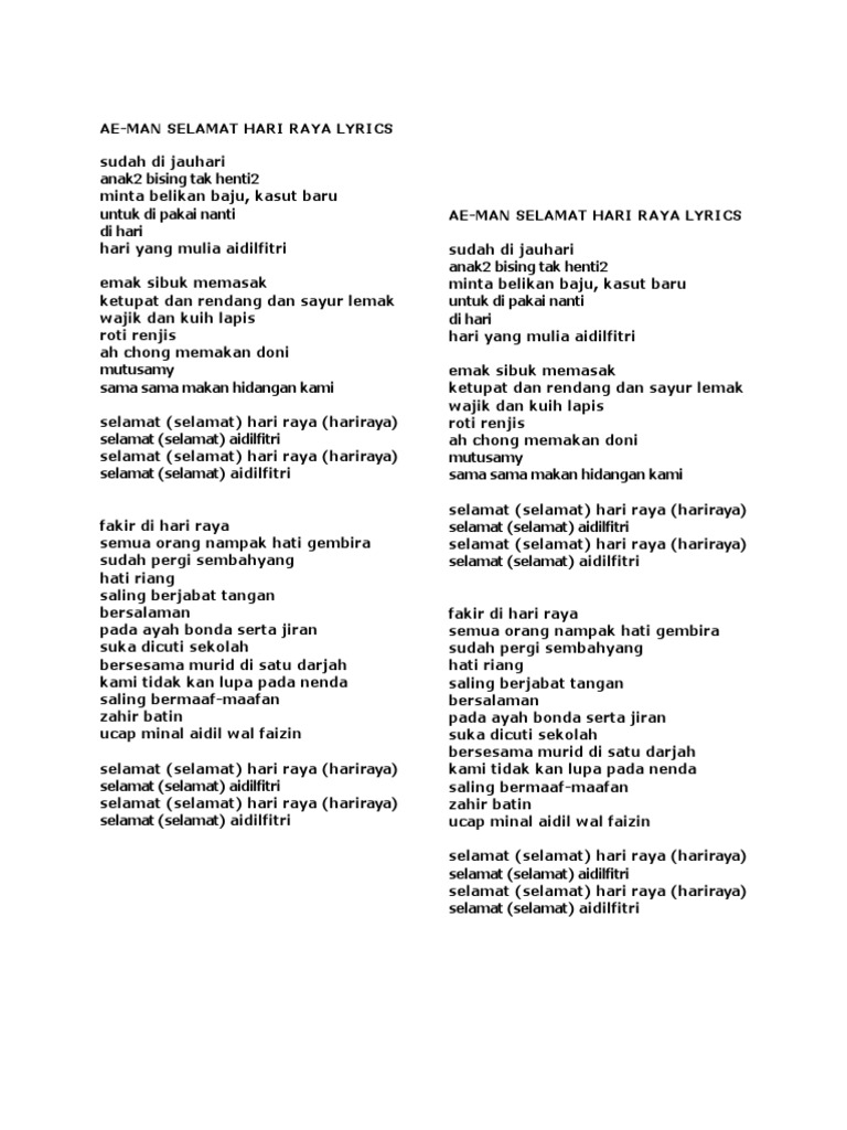 Hari raya genap sudah sebulan berpuasa hari raya mari ramai ramai kita gembira di hari raya kita saling bermaaf maafan hari raya mari ramai ramai jemput ke rumah. Emak pun sibuk memasak ketupat dan rendang dan sayur lemak wajik dan kuih lapis roti renjis. Lirik lagu selamat hari raya.