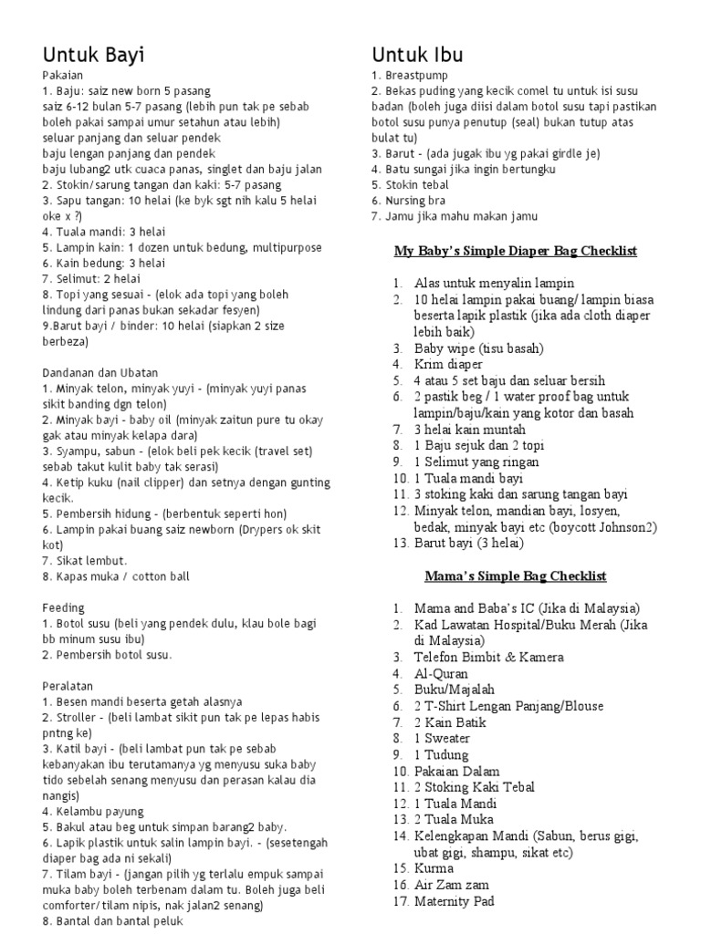 Checklist Barang Keperluan Bayi Newborn Baby Checklist Dan Keperluan Bersalin Labor Delivery Checklist