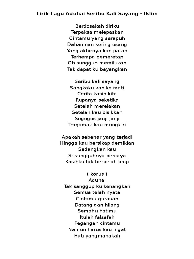 Berikut ini adalah lirik dan chord lagu aduhai seribu kali sayang dari iklim. Seribu kali sayang sangkaku kan ke mati cerita kasih kita rupanya seketika setelah merelakan setelah kau bisikkan segugus. Lagu yang dirilis pada 1993 ini merupakan salah satu singel dari album kolaborasi dari dua musisi wan zul dan saleem yang berjudul gabungan 2 insan seni.