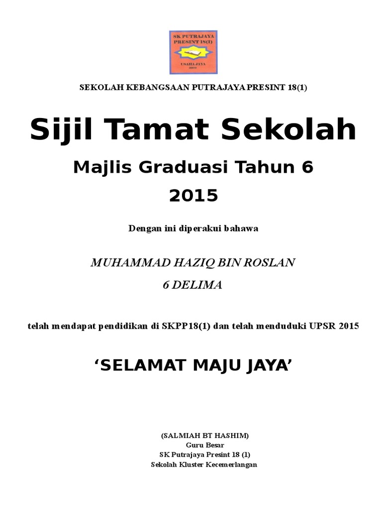 Sijil disampaikan oleh guru besar. Muhammad haziq bin roslan 6 delima telah mendapat pendidikan di skpp18 1 dan telah menduduki upsr 2015. Sekolah kebangsaan putrajaya presint 18 1 sijil tamat sekolah majlis graduasi tahun 6 2015 dengan ini diperakui bahawa.