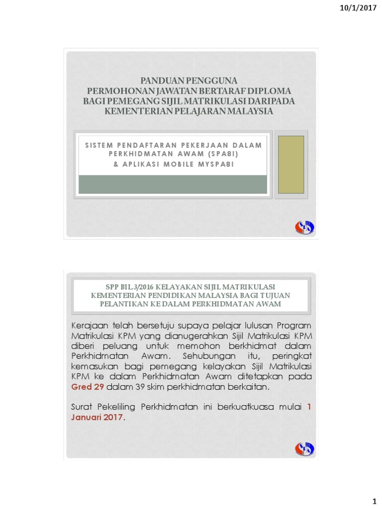 Penyerahan sijil matrikulasi kpm. Hanya maklumat keputusan yang diterima daripada bahagian matrikulasi dipaparkan di sistem spa9 permohonan tertakluk kepada dasar one step lower pemohonan setaraf diploma tidak layak memohon jawatan bertaraf pt3 pmr srp. Kelayakan minimum diploma setaraf lulus peperiksaan sijil pelajaran malaysia spm atau peperiksaan yang diiktiraf setaraf dengannya oleh kerajaan.