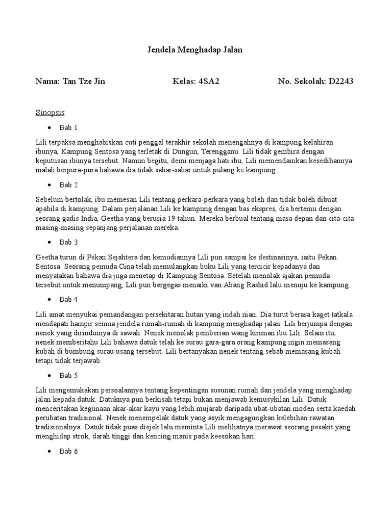 262211423 Sinopsis Ikut Bab Novel Komsas Jendela Menghadap Jalan Tingkatan 4 1 Pdf Document