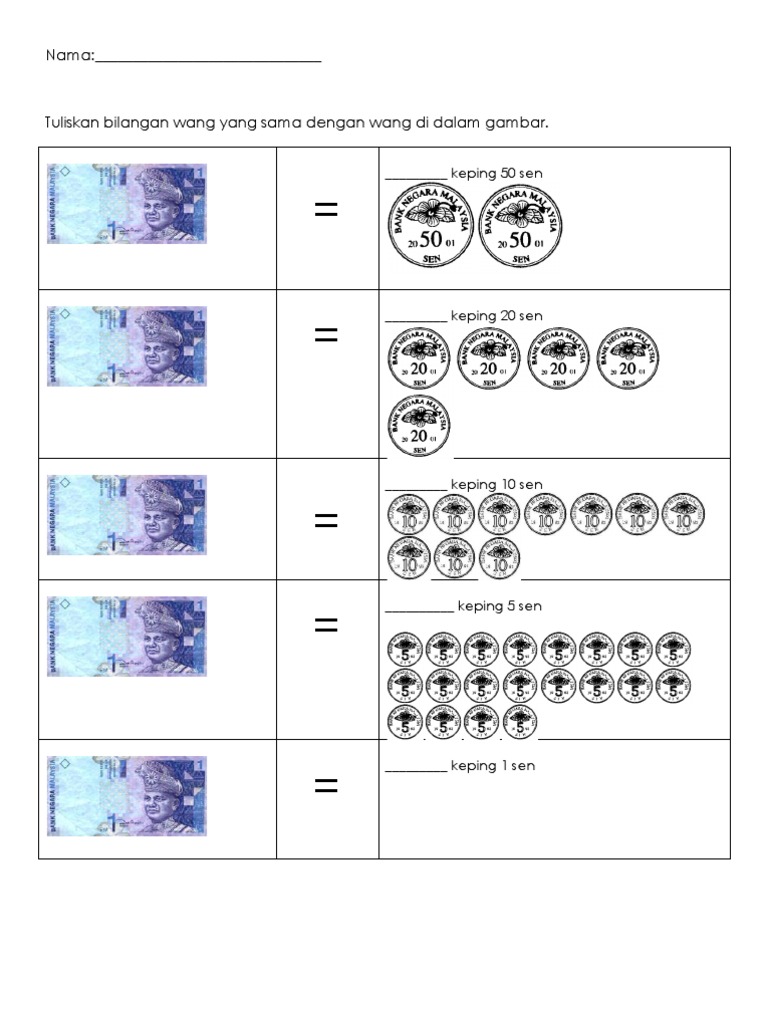 Soalan Matematik Wang Tahun 1 Kosong Kerja