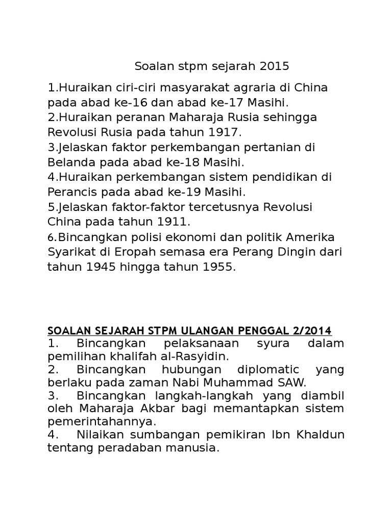 Soalan sejarah stpm penggal 2 2015. Sijil tinggi persekolahan malaysia. Trial examination papers answers. Gb in soalan stpm 0 comments soalan pengajian am penggal 2 tahun 2015 adalah sebahagian kertas soalan yang telah berjaya dikumpulkan dan dikemaskini oleh gurubesar my.