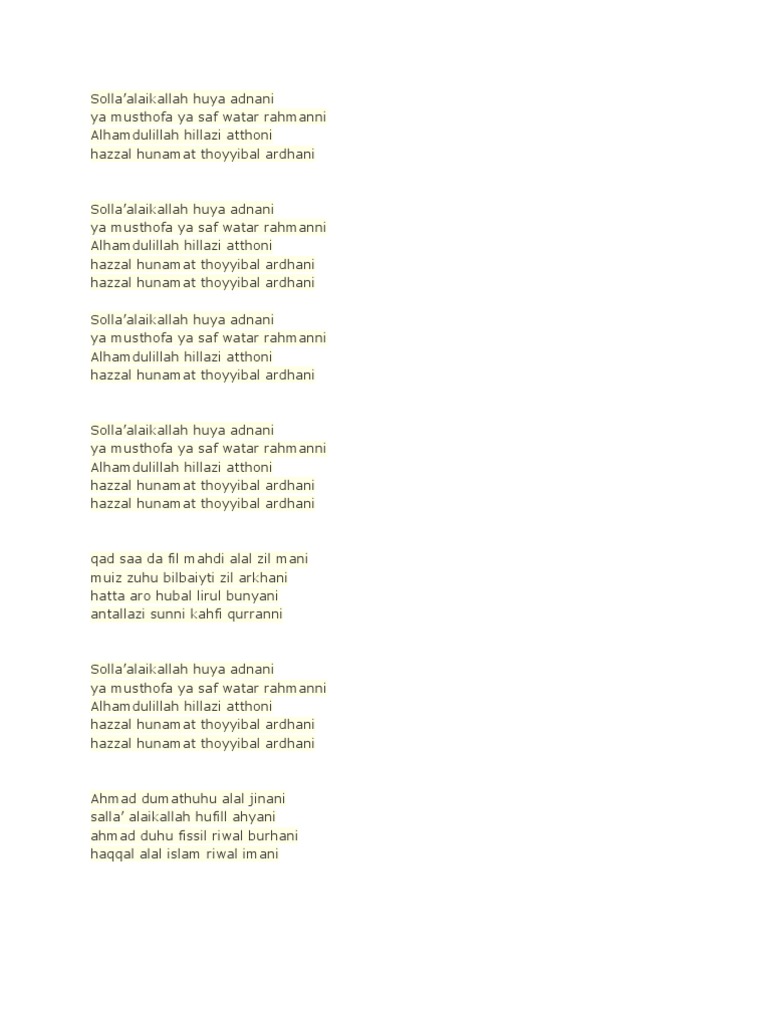 Solla alaikallah huya adnani ya musthofa ya saf watar rahmanni alhamdulillah hillazi atthoni hazzal hunamat thoyyibal ardhani hazzal hunamat thoyyibal ardhani qad saa da fil mahdi alal zil mani muiz zuhu bilbaiyti zil arkhani hatta aro hubal lirul bunyani antallazi sunni kahfi qurranni. Qad saa da fil mahdi alal zil mani muiz zuhu bilbaiyti zil arkhani hatta aro hubal lirul bunyani antallazi sunni kahfi qurranni. It is important to note that after abdul mutalib s demise several verses of salawat adnan e g.
