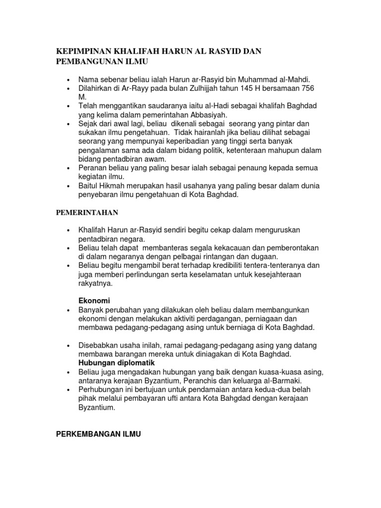 Sumbangan kerajaan bani abbasiyah dalam perkembangan ilmu pengetahuan. Khalifah harun al rasyid lahir di rayy iran pada tahun 763 149 h dan meninggal dunia pada tahun 809 di thus khurasan baginda merupakan seorang yang mempunyai sifat sifat seperti gagah berani menyukai hal hal agama bijak berpolitik dan cinta akan ilmu pengetahuan baginda telah dilantik sebagai putera mahkota pada tahun 782 166 h dan menjadi khalifah abbasiyah kelima pada tahun 786 809 170. Khalifah harun al rasyid lahir di rayy iran pada tahun 763 149 h dan meninggal dunia pada tahun 809 di thus khurasan baginda merupakan seorang yang mempunyai sifat sifat seperti gagah berani menyukai hal hal agama bijak berpolitik dan cinta akan ilmu pengetahuan baginda telah dilantik sebagai putera mahkota pada tahun 782 166 h dan menjadi khalifah abbasiyah kelima pada tahun 786 809 170.