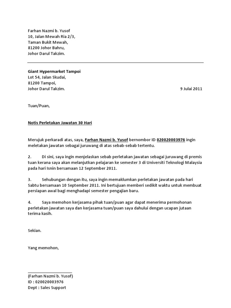 Surat Berhenti Kerja Notis Seminggu English