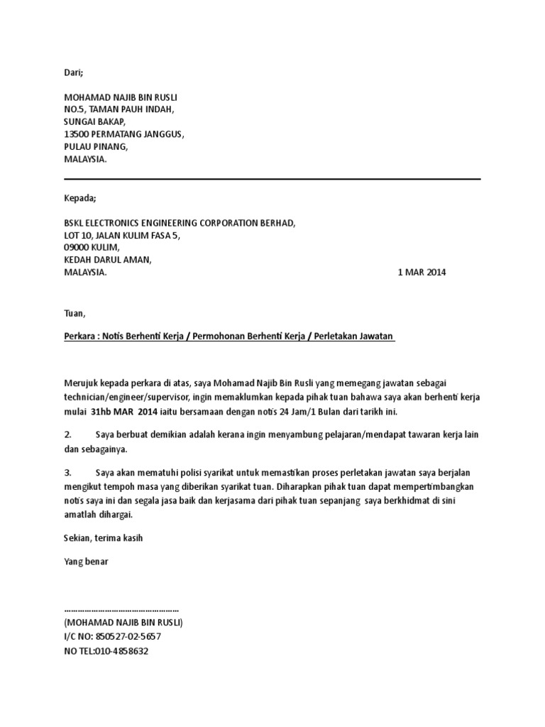 Surat berhenti kerja notis 1 bulan. Jenis dan format surat berhenti kerja notis 24 jam. 5757 taman kakipromo 454517 bukit beruang melaka. Semoga bermanfaat untuk anda yang sedang menulis format surat berhenti kerja.