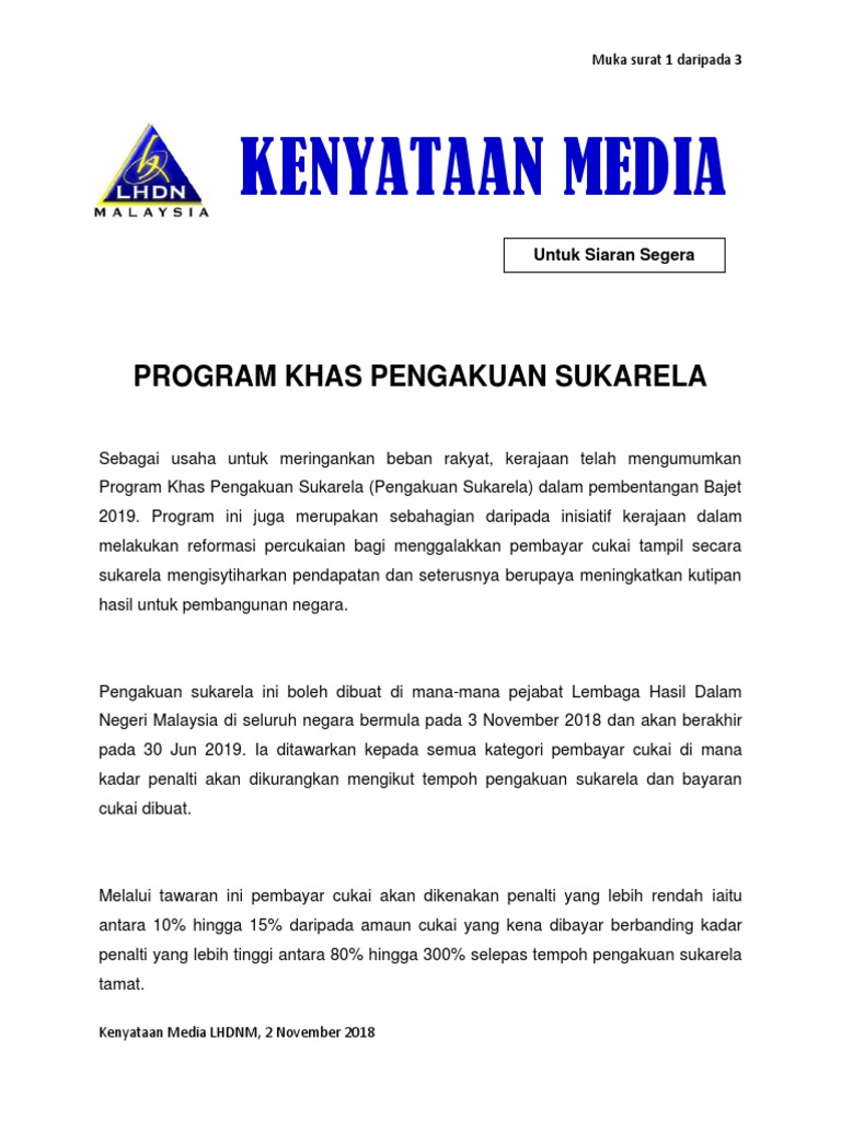 Program khas ini meliputi pendedahan dan pembayaran secara sukarela pada. 5 2 pengakuan sukarela meliputi. Anyone else got this attachmentid 10110394 pembayar cukai yang dihormati makluman program khas pengakuan sukarelaprogram ini diperkenalkan oleh kerajaan dalam bajet 2019 pada 2 november 2018 untuk menggalakkan orang ramai melapor secara sukarela pendapatan yang belum atau kurang dilapor sebelum ini.