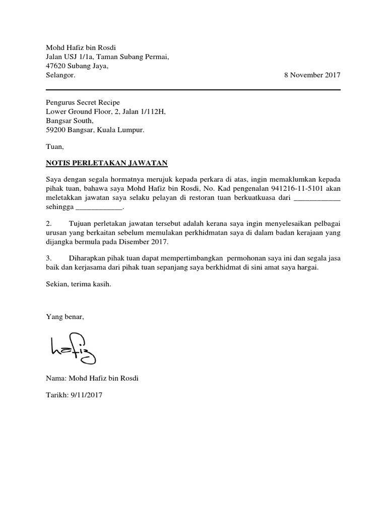 Berikut dikongsikan contoh surat berhenti kerja terbaik yang mudah dan ringkas perkongsian contoh surat rasmi notis berhenti kerja resignation letter adalah dalam bahasa malaysia dan inggeris yang merangkumi notis perletakan jawatan samada 24 jam ataupun sebulan. Contoh surat berhenti kerja terbaik lengkap 2020. Secara amnya surat letak jawatan yang bergaji ini juga dipanggil surat berhenti kerja atau surat resign kerja formatnya lebih kurang sama sahaja.