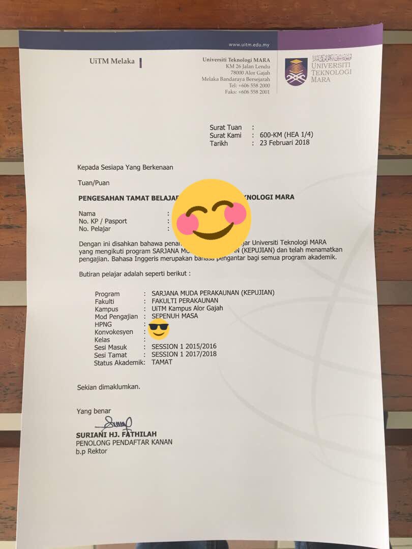 Surat tamat belajar uitm. Laman ini menawarkan pelbagai maklumat yang berkaitan dengan tawaran kemasukan ke uitm. Hebahan keputusan program sarjana muda sepenuh masa bagi lepasan penerapan semester akhir diploma uitm sesi 1 2020 oktober 2020 hebahan keputusan dan semakan surat tawaran ke program sarjana muda sepenuh masa bagi lepasan penerapan semester akhir diploma uitm boleh disemak mulai 01 oktober 2020 jam 12 00 tengah hari. Selang masa antara tarikh akhir pengajian dan tarikh sebenar lapor diri jika ada dalam tempoh satu 1 ke empat belas 14 hari selepas tarikh akhir pengajian tidak akan dirujuk kepada unit integriti sebagai ketidakhadiran bertugas tetapi dikira sebagai tanpa gaji.