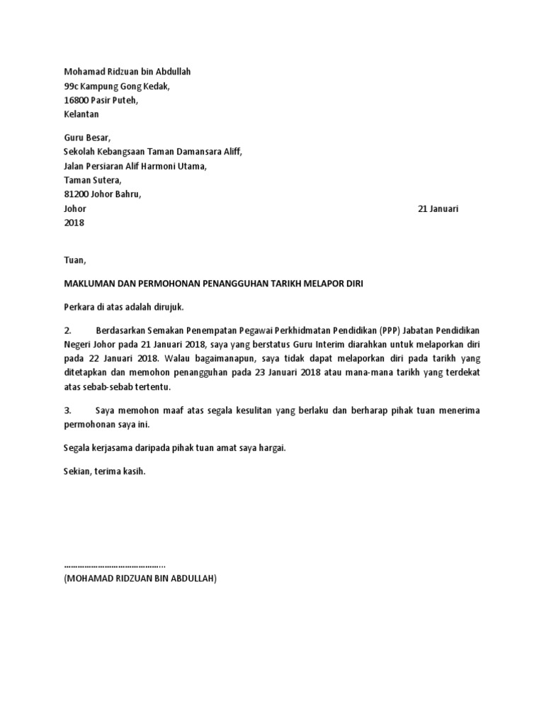 Contoh Surat Rasmi Permohonan Penangguhan Lapor Diri