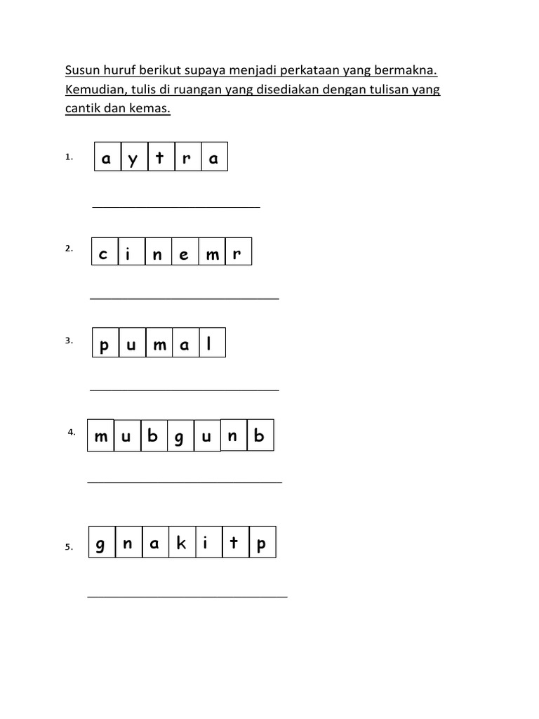 Contextual translation of susun huruf menjadi perkataan into english. Perkataan melontarkan menunjukkan maksud sepotong kayu sebagai objek t. Susun perkataan supaya menjadi ayat yang betul 1.