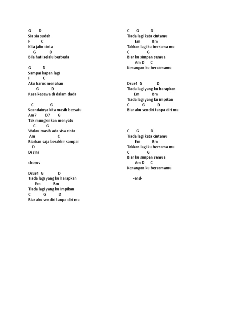 Akhirnya ku sendiri lagi setelah lewati hariku dengannya akhirnya ku termenung lagi cinta berlalu begitu saja tak pernah ku dapat yang setia apa karna ku tidak sempurna selalu saja aku yang salah dan akhirnya aku yang menderita reff. Katakan ku takkan datang pastikan ku takkan kembali lalu biarkan dia menangis lalu biarkan dia pergi. Takkan lagiku sendiri kasih yang berlabuh kini terasa keabadian cinta kau beri mungkinkah daku bermimpi sebahagia begini ini bukan ilusi oh kasih seindah irama gemersik suaramu mengalun sepiku yang merindu akan ku sahut cintamu itu bersama kita menuju bahagia takkan lagiku sendiri kasih yang berlabuh kini terasa keabadian cinta kau beri.