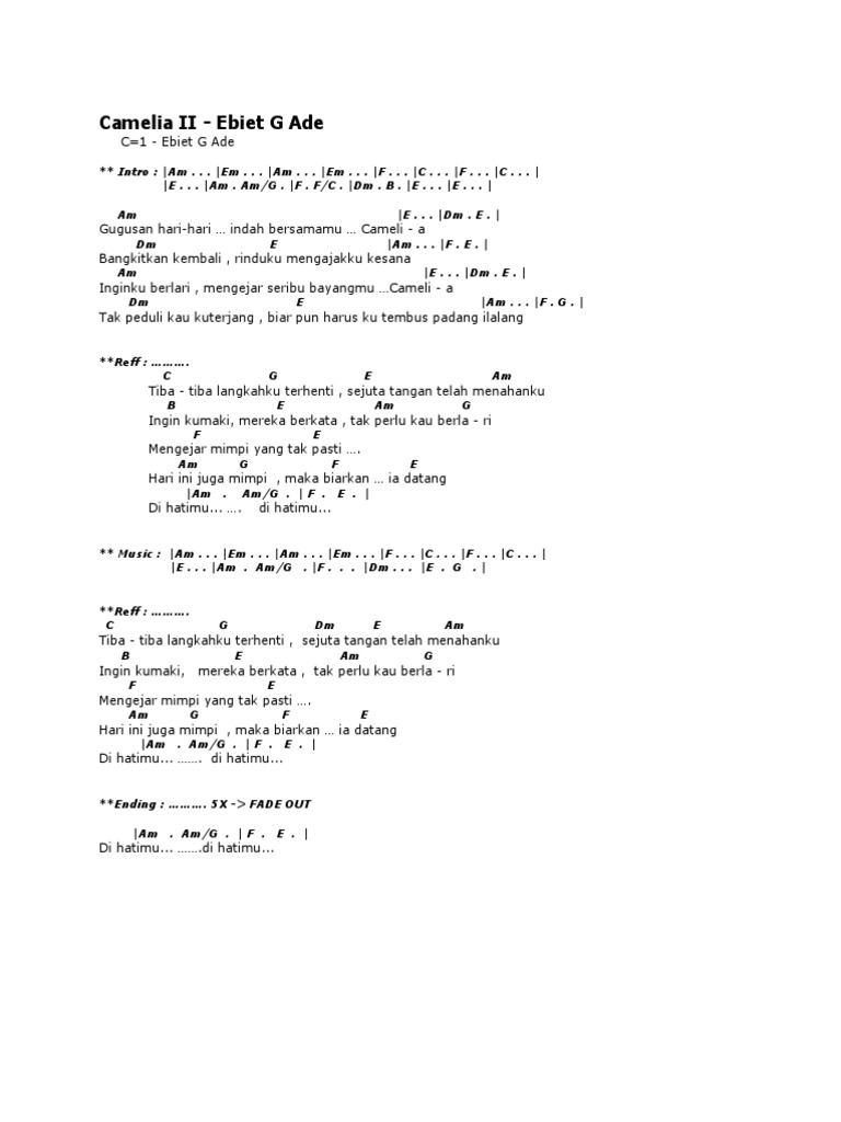 Dm tak peduli kan ku terjang e biar pun harus kutembus am f g padang ilalang chorus c g tiba tiba langkahku terhenti dm e am sejuta tangan telah menahanku b7 e inginku mati mereka berkata am g tak perlu kau berlari f e mengejar impian tak pasti am g hari ini juga mimpi f e maka biarkan ia datang am g di hatimu. Di hatimu kamelia dihatimu dihatimu. Ulang 1 sumbangan aliza ke halaman utama copyrigth 1999 imnogman tm zzz reversed tech inc.